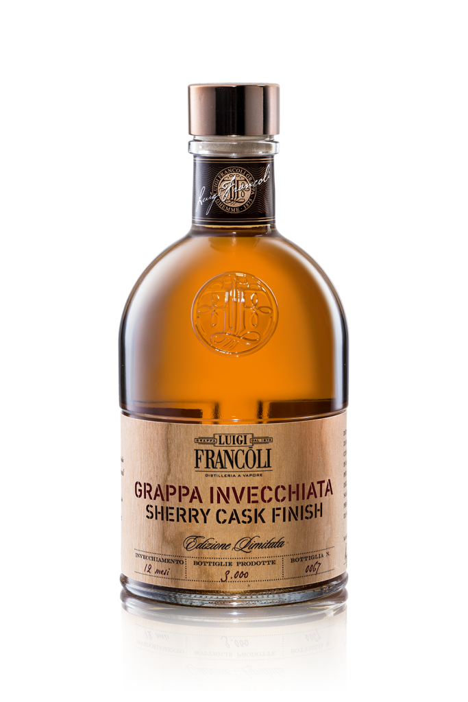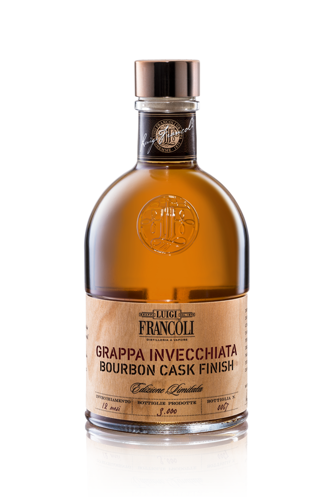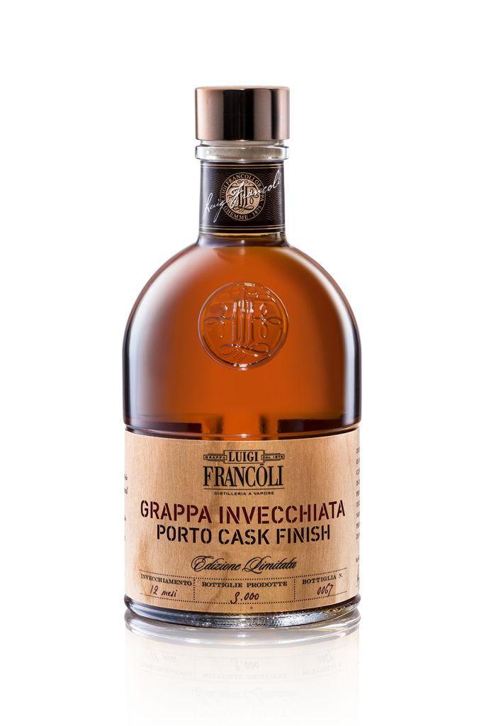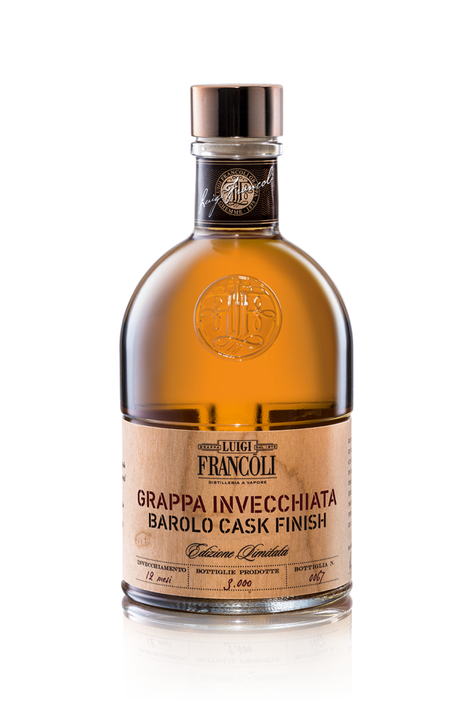 Anche gli elementi della confezione ci trasportano nel mondo della distillazione: il tappo simboleggia il rame dell’alambicco, l’etichetta, in vero legno, le botti in cui queste Grappe riposano.