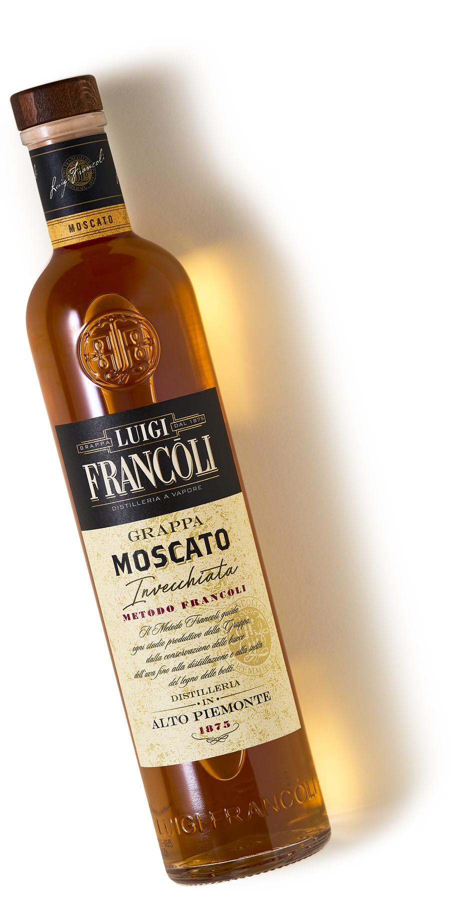 Pregiate vinacce di Moscato bianco del Piemonte delicatamente distillate da una carezza di vapore acqueo, generano una giovane Grappa di Moscato la quale fragranza olfattiva si esalta, in seguito, nella meravigliosa unione con le sensazioni suadenti, mature e avvolgenti caratteristiche dell’affinamento in botti di legno di piccole dimensioni.