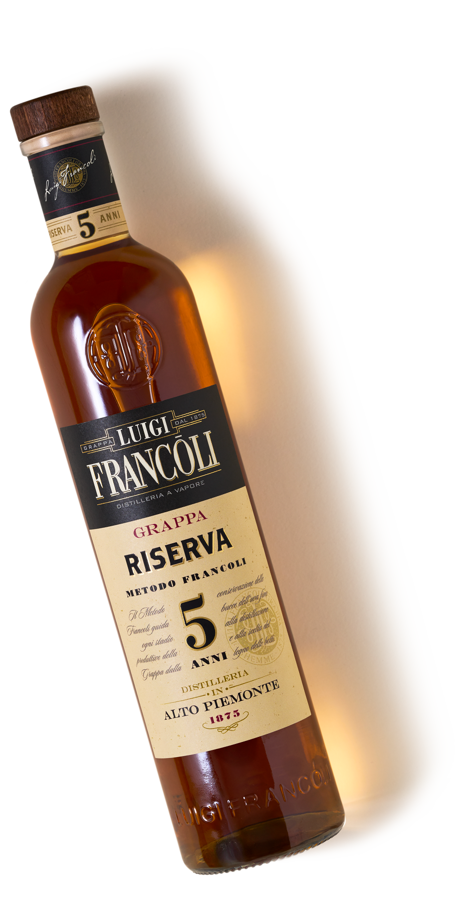 Distillata dalle pregiate e generose vinacce del Piemonte, è custodita in grandi fusti di rovere per un periodo lungo fino a cinque anni durante i quali si arricchisce dei tipici sentori del legno. Il lungo invecchiamento suggerisce l’uso di fusti di generose dimensioni (oltre 100 ettolitri) e dalle doghe di notevole spessore, così da garantire un corretto e moderato contatto tra il distillato e l’ossigeno dell’aria.