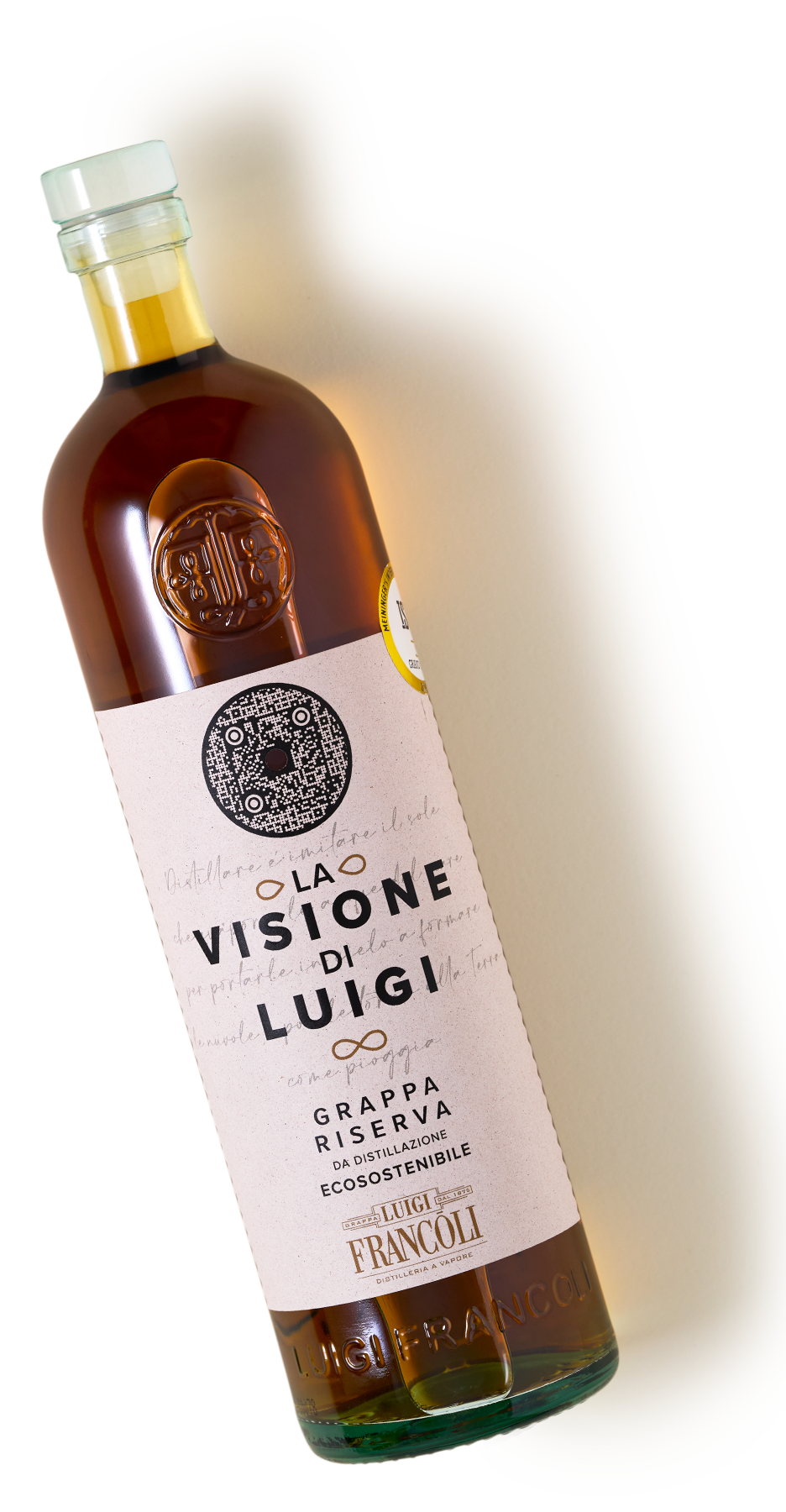 La grappa la Visione di Luigi Riserva vive una doppia maturazione: la prima è un prolungato riposo in tini di rovere di slavonia, la seconda è un più rapido passaggio in piccole botti di rovere di limousin.
